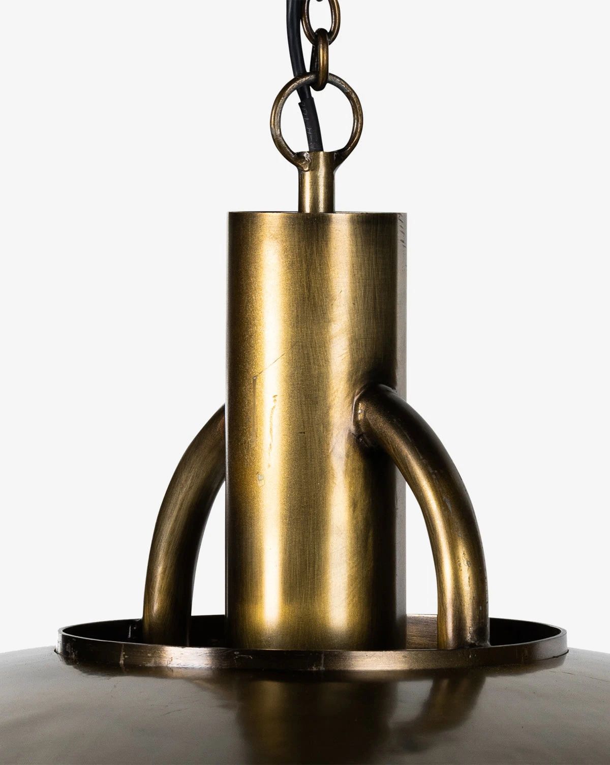 With a contemporary yet industrial feel, the thoughtful design of the Arely Pendant gives it a unique beauty. The large brass-finished shade features a subtly perforated edge, lending delicate detail to the boldly exposed bulb.