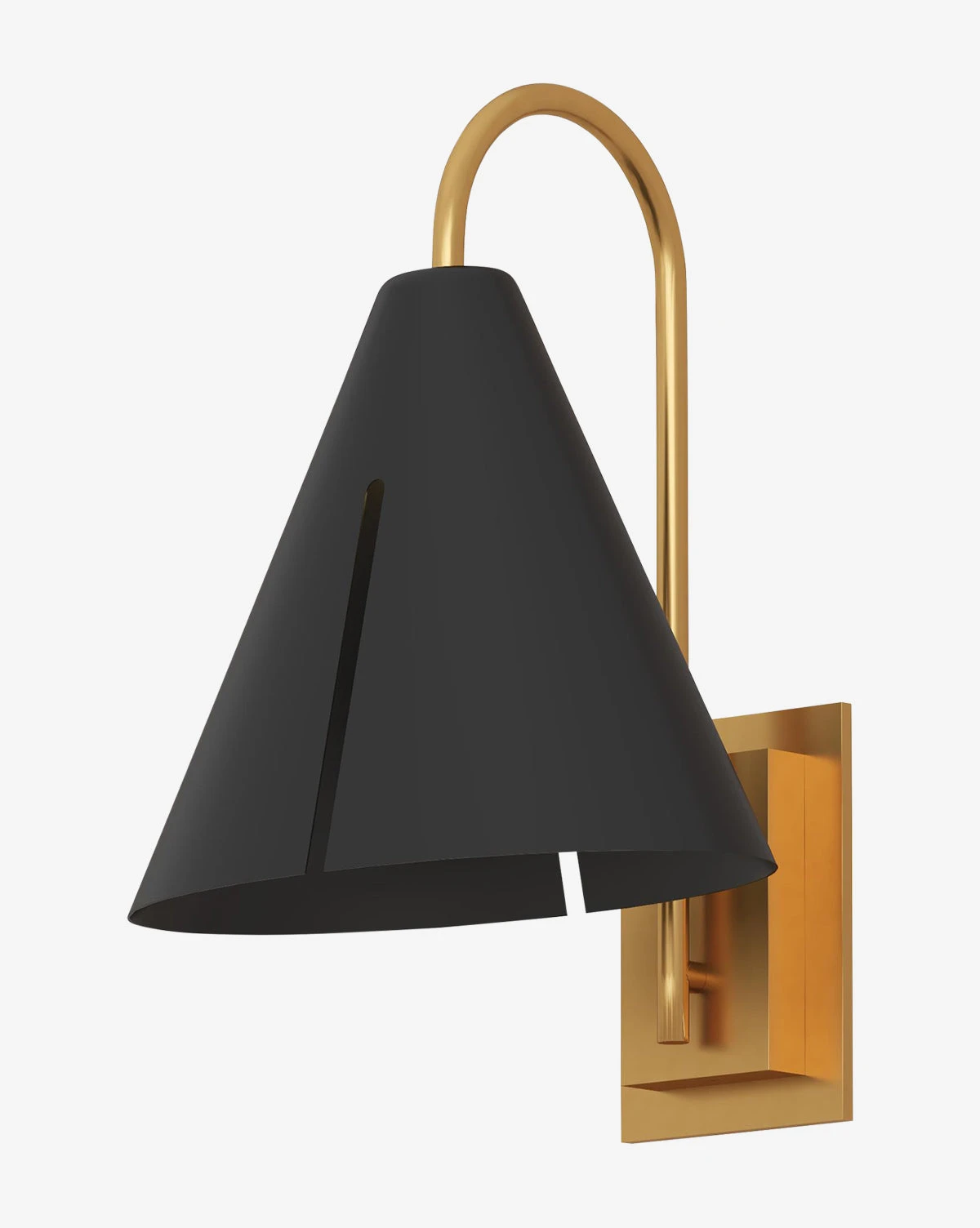 Sleek and modern, the Cambre Small Task Sconce features a long overhead arm and tiered backplate in elegant, burnished brass. Its steel shade is unique, featuring two slits that allow the light to pour out. Available in either matte white or black, this task sconce is a beautiful addition to your space.