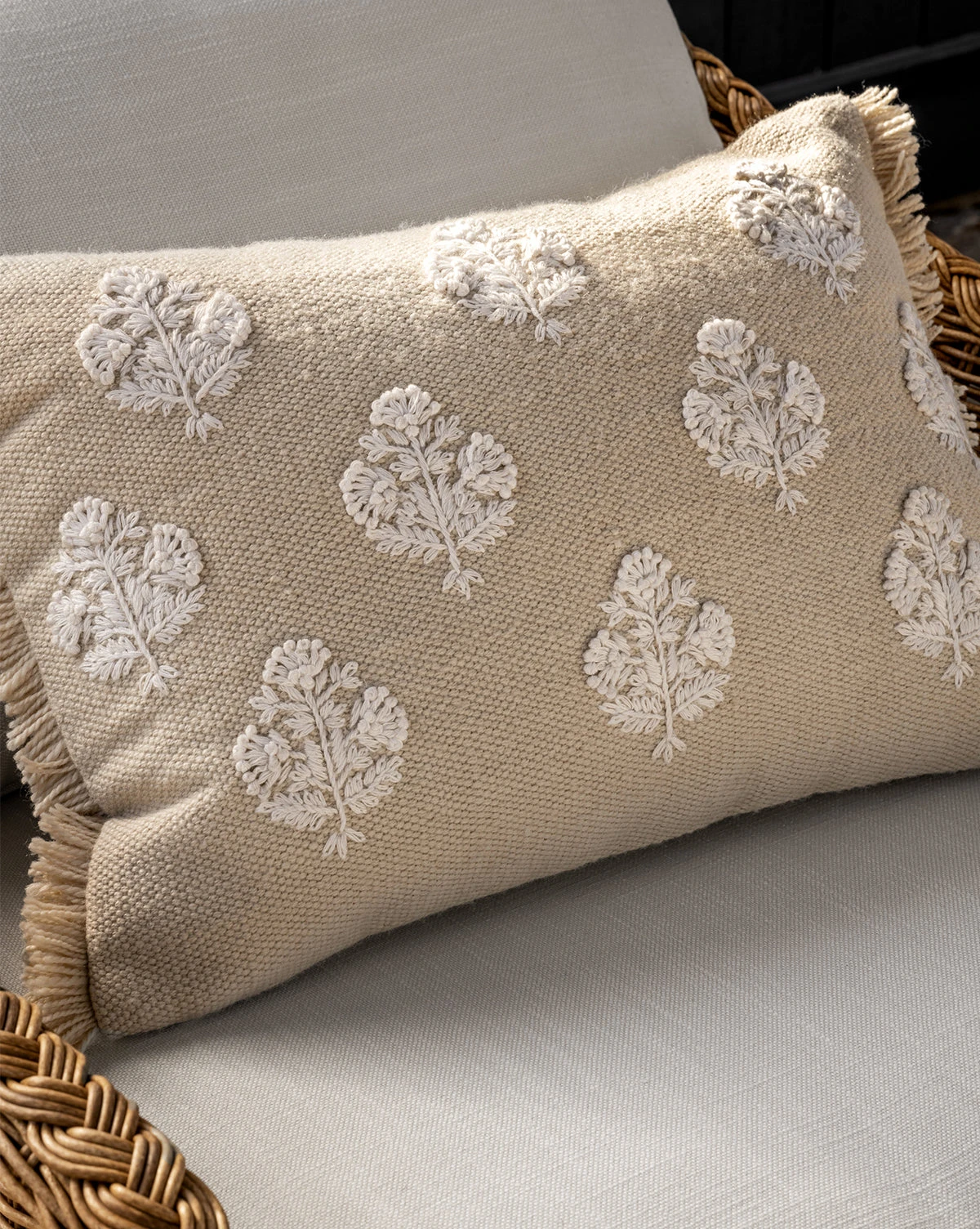 With a textured tan front with floral stitching in a classic motif, the Carina Indoor/Outdoor Pillow brings welcoming detail to your outdoor decor. Crafted to be both soft to the touch and weather resistant, this pillow is as durable and versatile as it is beautiful.