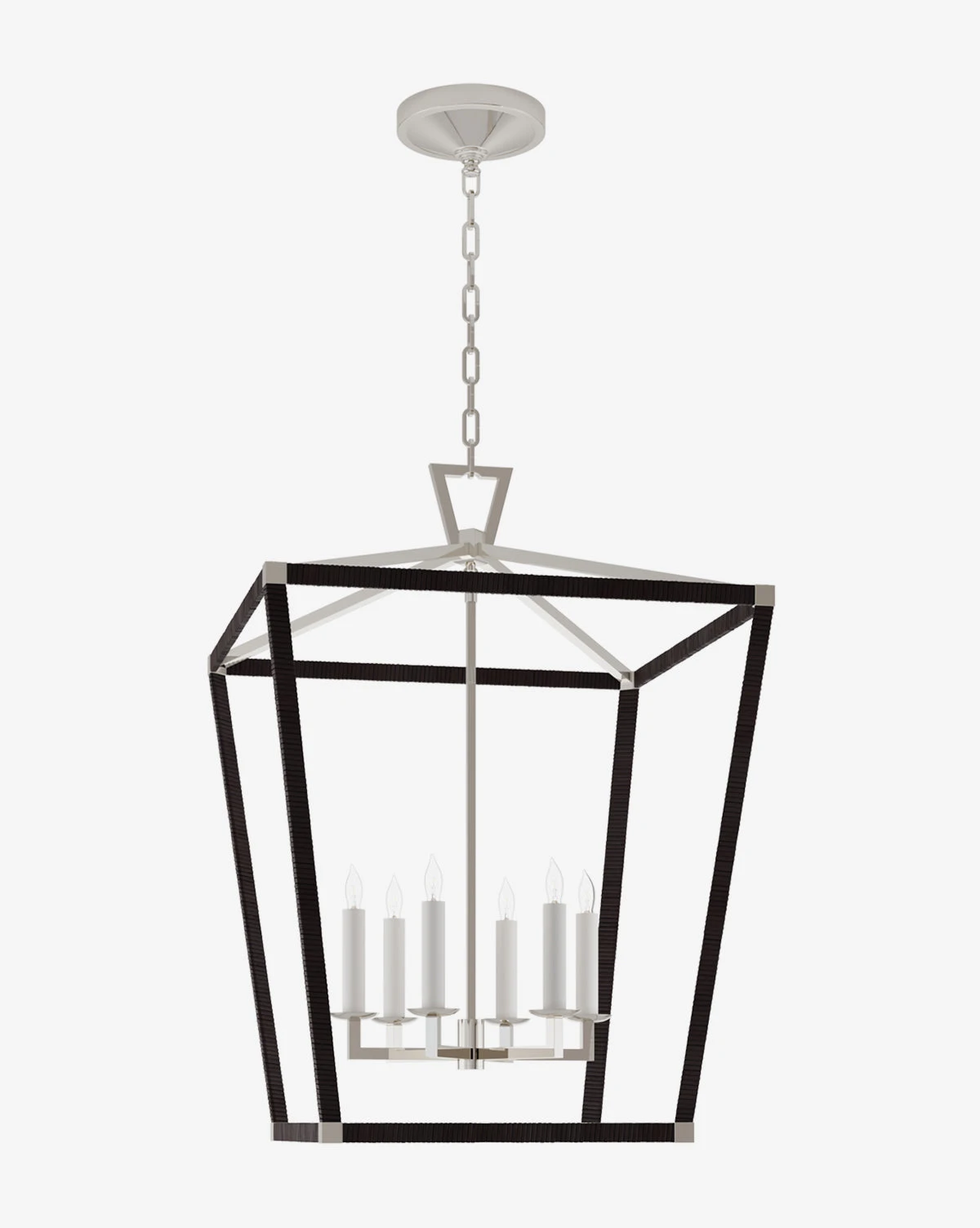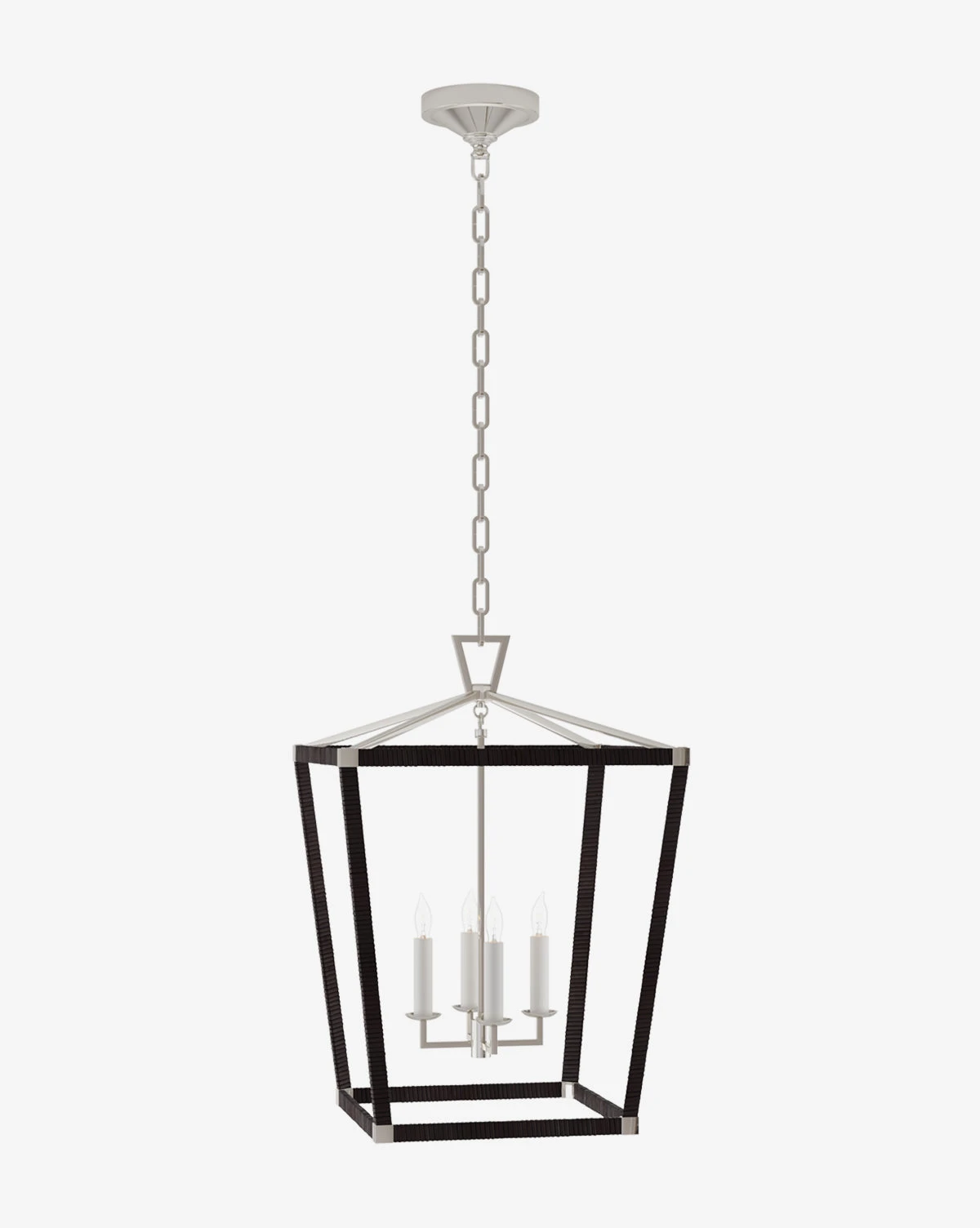 The Darlana Wrapped Lantern is inspired by the traditional lantern but given a modern update. Sleek lines and rattan details, with a suspended candelabra, make for an ideal contemporary pendant for the entryway, dining, or kitchen area.