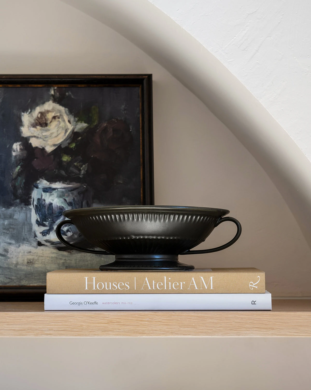 Crafted from stoneware in a unique, shallow shape, the Fluted Bowls makes a stunning addition to your built-in vignettes. Its black finish gives depth and contrast to the piece, and its pronounced, elegant handles lend delicate detail to its form. The Fluted Vase is reminiscent of a more ancient time, with contemporary updates that characterize the piece.