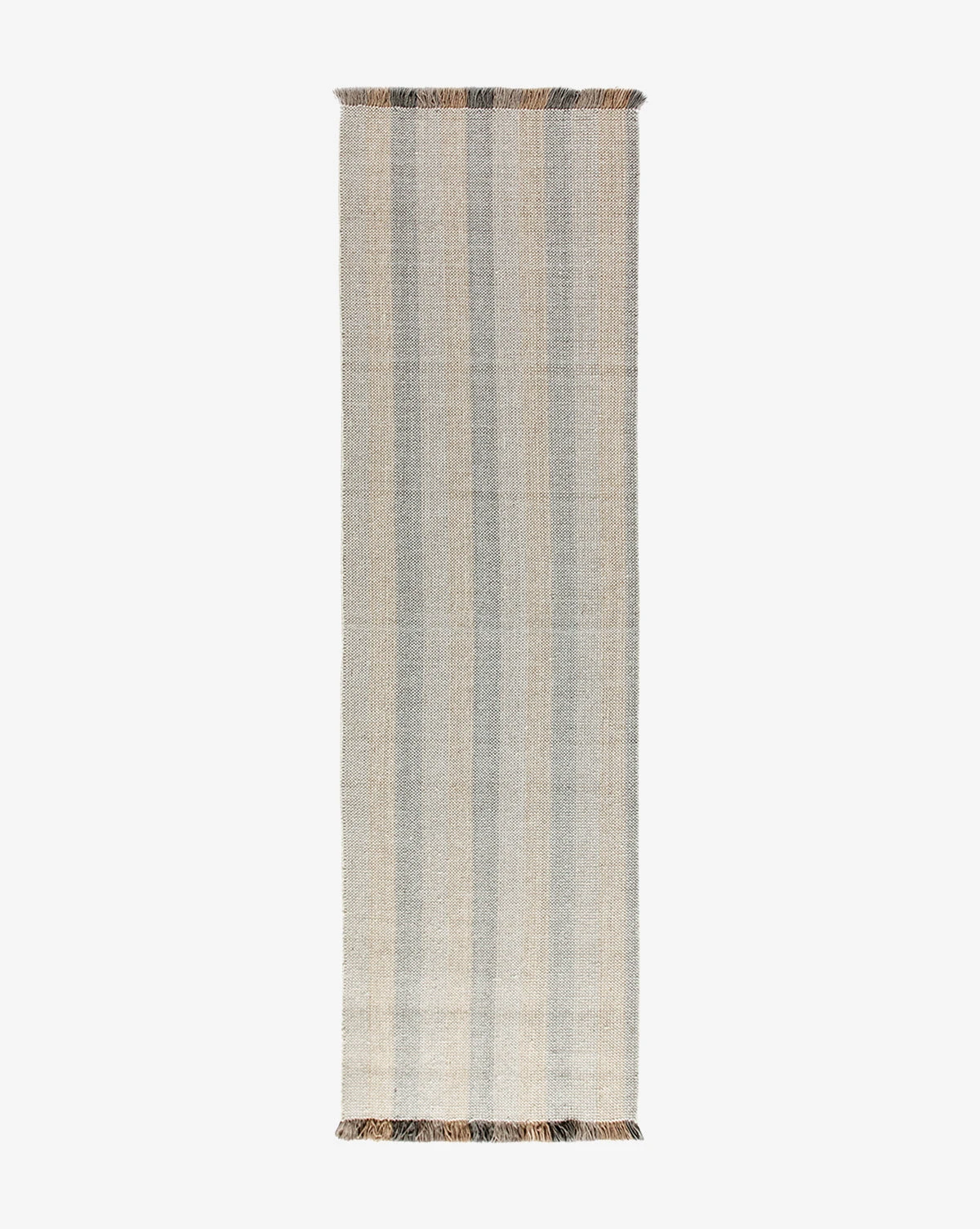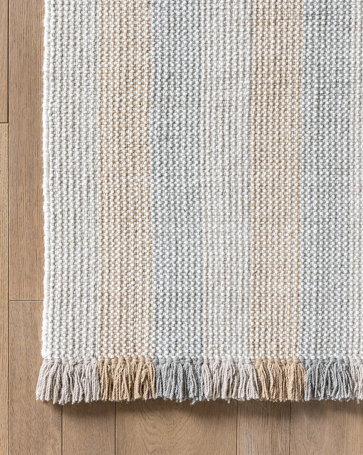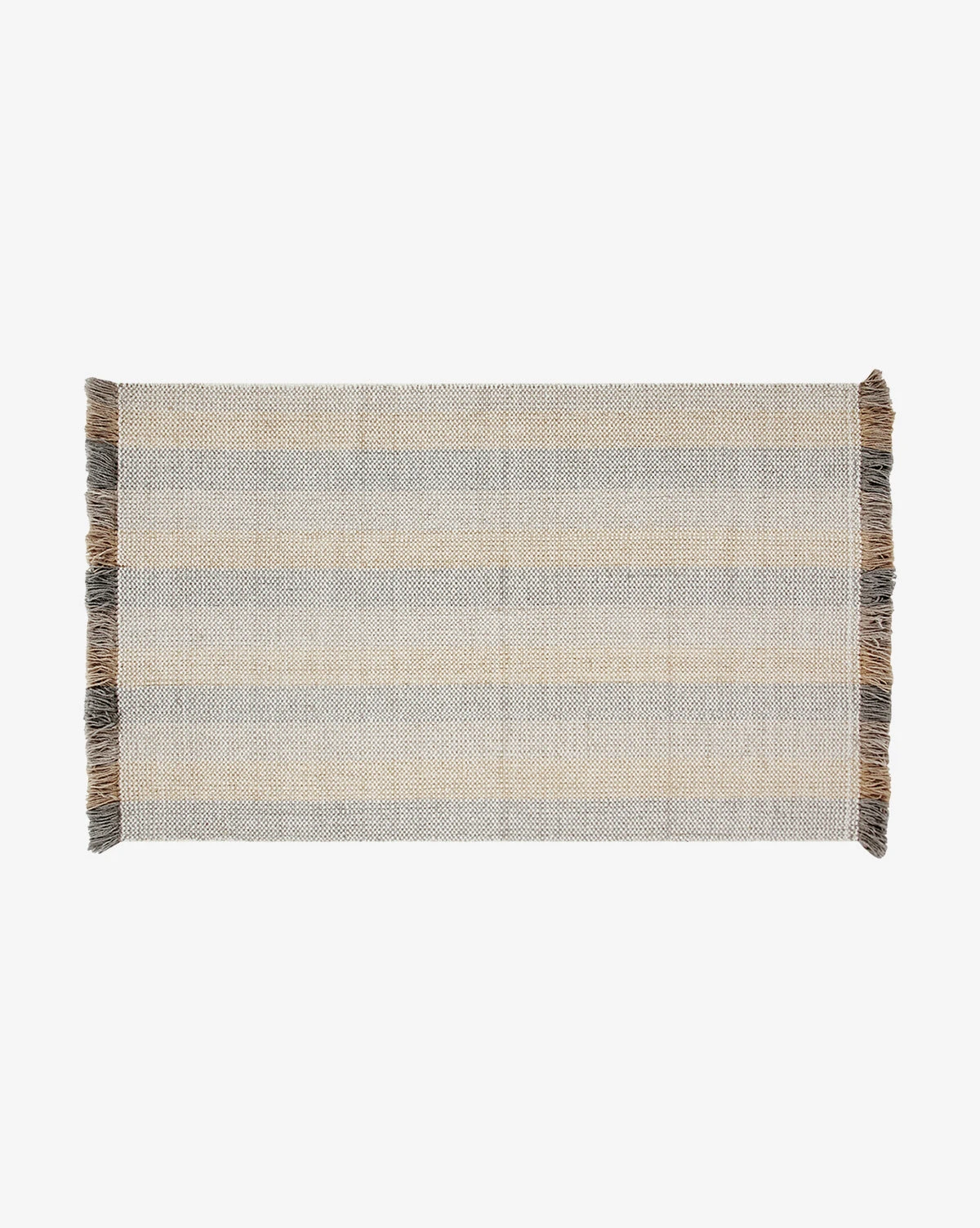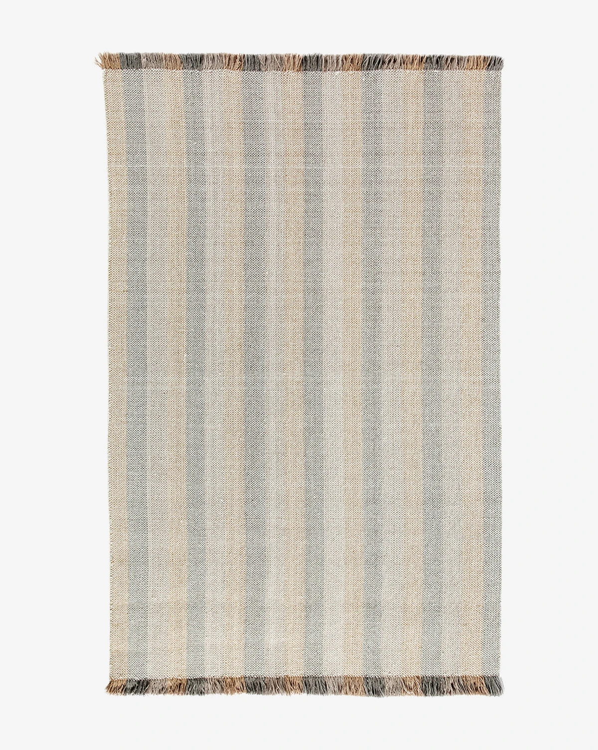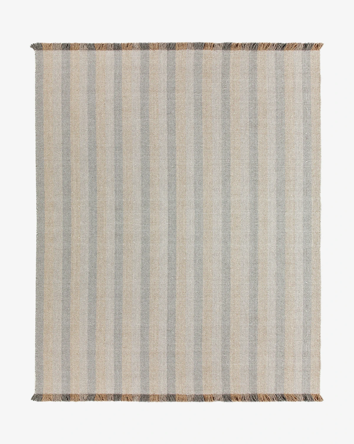 Contrasted tones bring a playful quality to our eclectic Grandby Handwoven Wool Rug. In hazy, muted hues of rose, beige, and gray-toned brown, the rug itself has a handwoven striped design with fringe that extends this pattern in brighter, richer tones of the same palette.