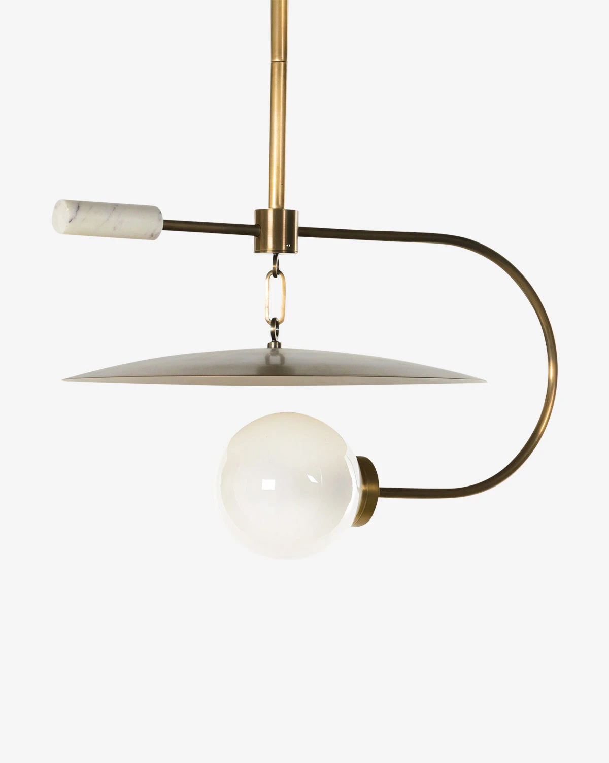 Contemporary in design, the Harpo Pendant has an artful shape that plays with shape and line. White marble detailing and an antique brass finish lend a material focus to the piece, highlighting the care and detail expressed in its form.
