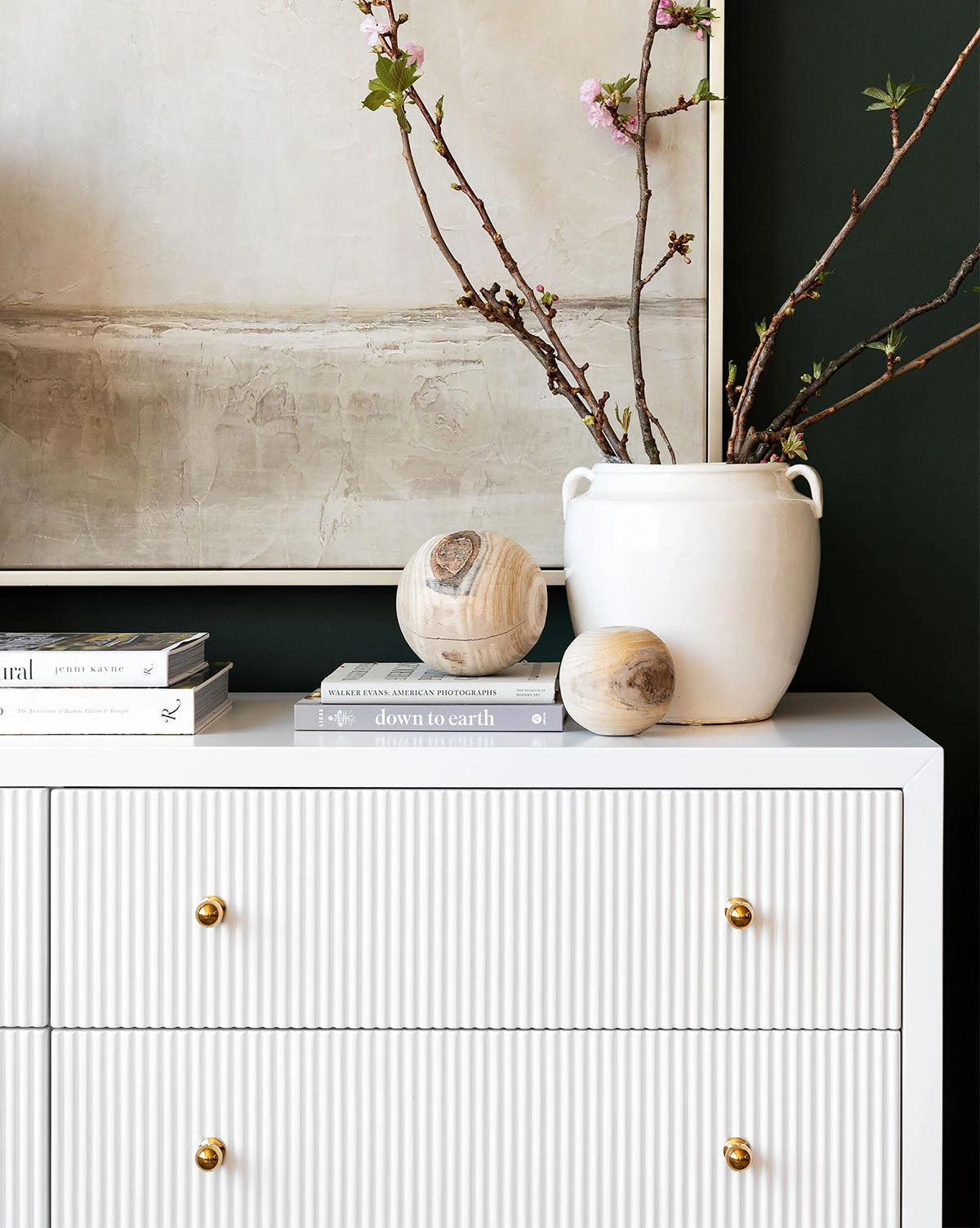The Mireya Vase has a time-honored look, featuring a simple shape, creamy white finish, and subtle distressing. Add to the living room’s built-in or kitchen’s open shelf to easily elevate your styling.
