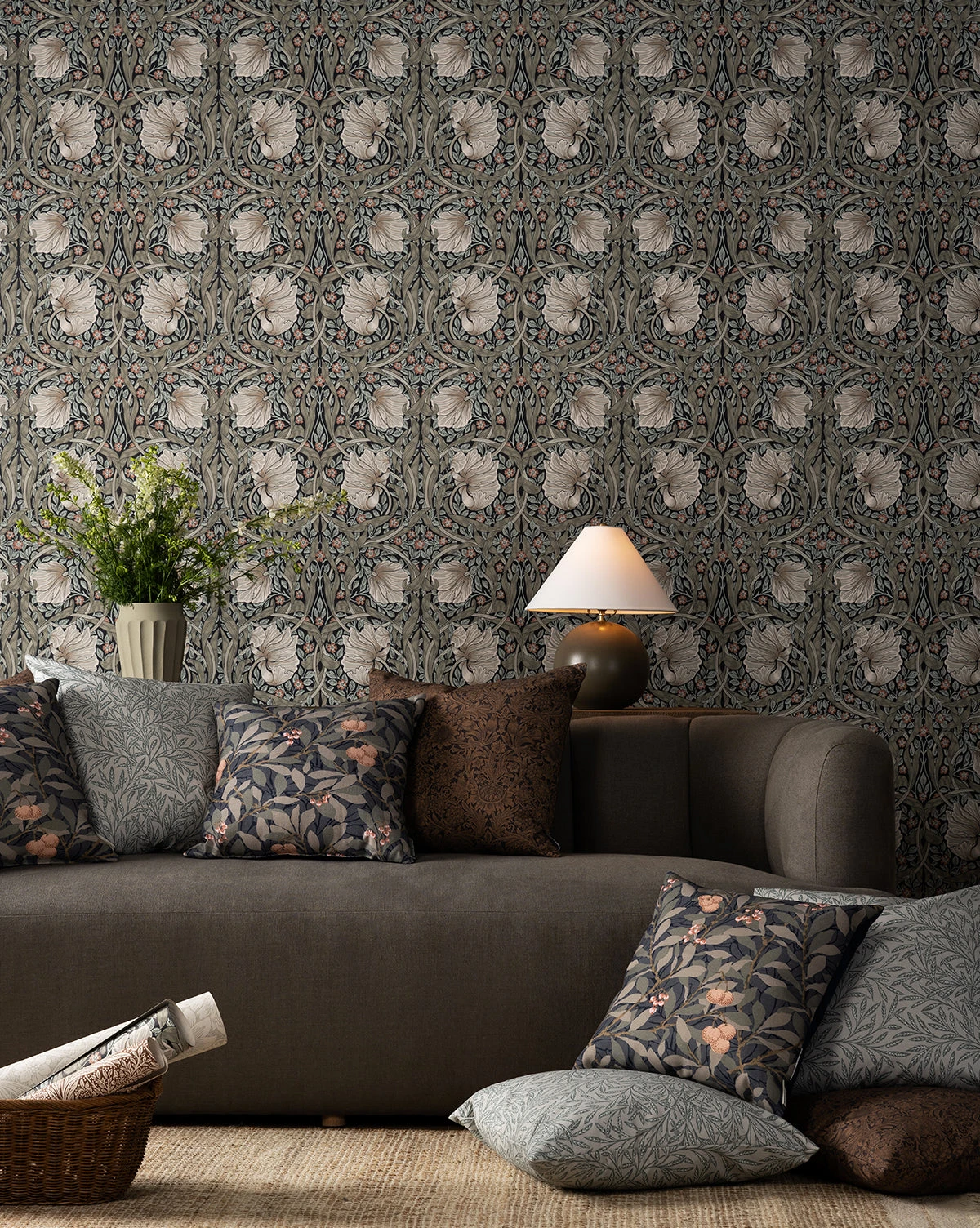 The Pimpernel Ink Wallpaper is a signature 1876 Morris & Co. pattern reimagined in a new color palette, created exclusively for McGee & Co. in collaboration with Shea McGee. The dramatic motif features a softened floral effect in a deep tone, enhancing every detail of the space it occupies.