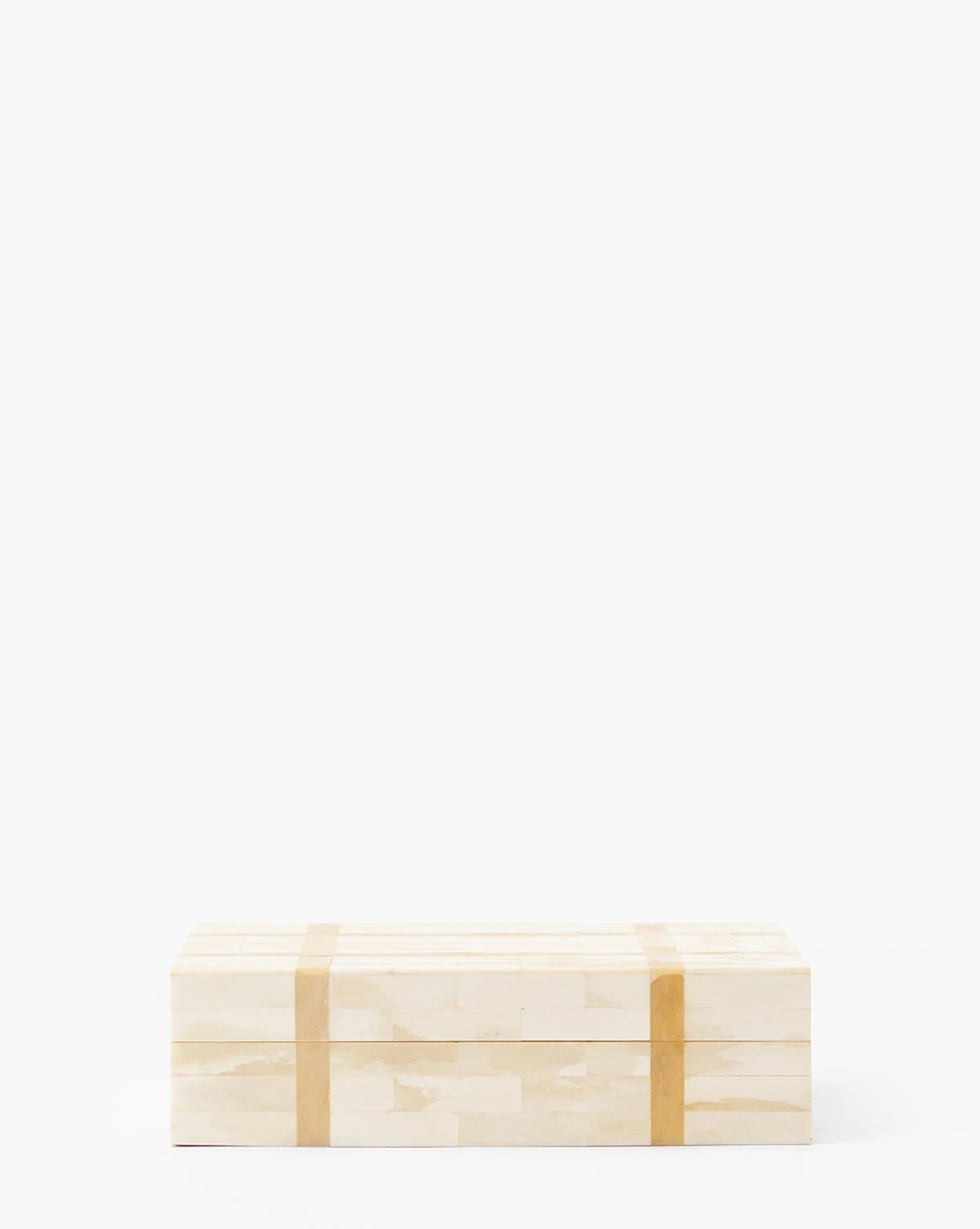 Organic materials bring an element of warmth to the Paige Bone Box. Crafted from bone and horn, we designed this piece with straightforward lines that highlight all the natural deviations in the color of each material. Perfectly suited as a small storage piece while elevating your decor, the Paige Bone Box makes its home anywhere from bookshelves to built-ins.