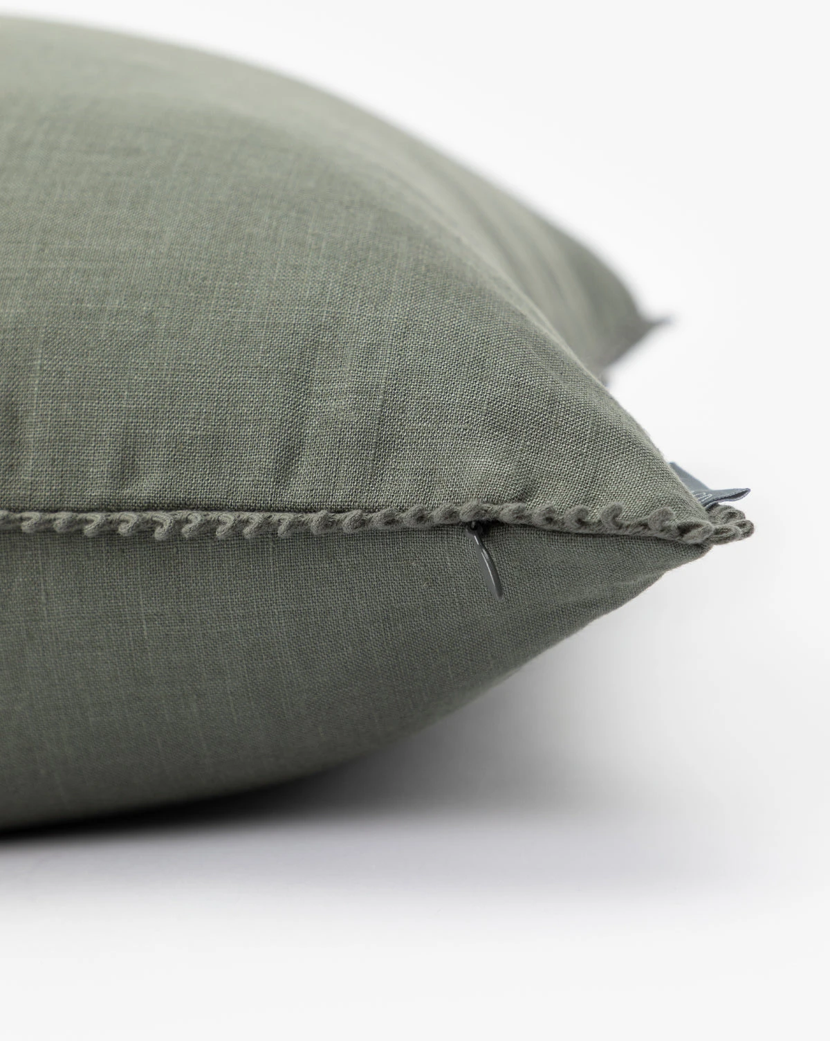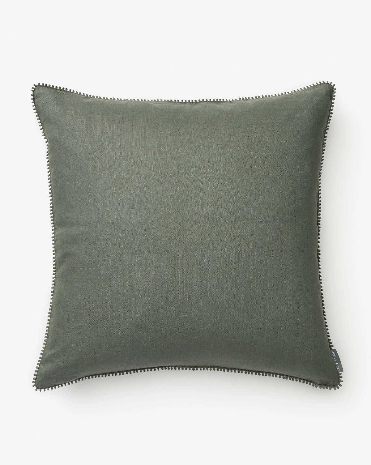 The subtle stitched fringe border around the Pennywood Pillow Cover elevates its rich green hue. Crafted from 100% linen, the pillow cover is sophisticated yet inviting, seamlessly complementing a layered pillow styling.