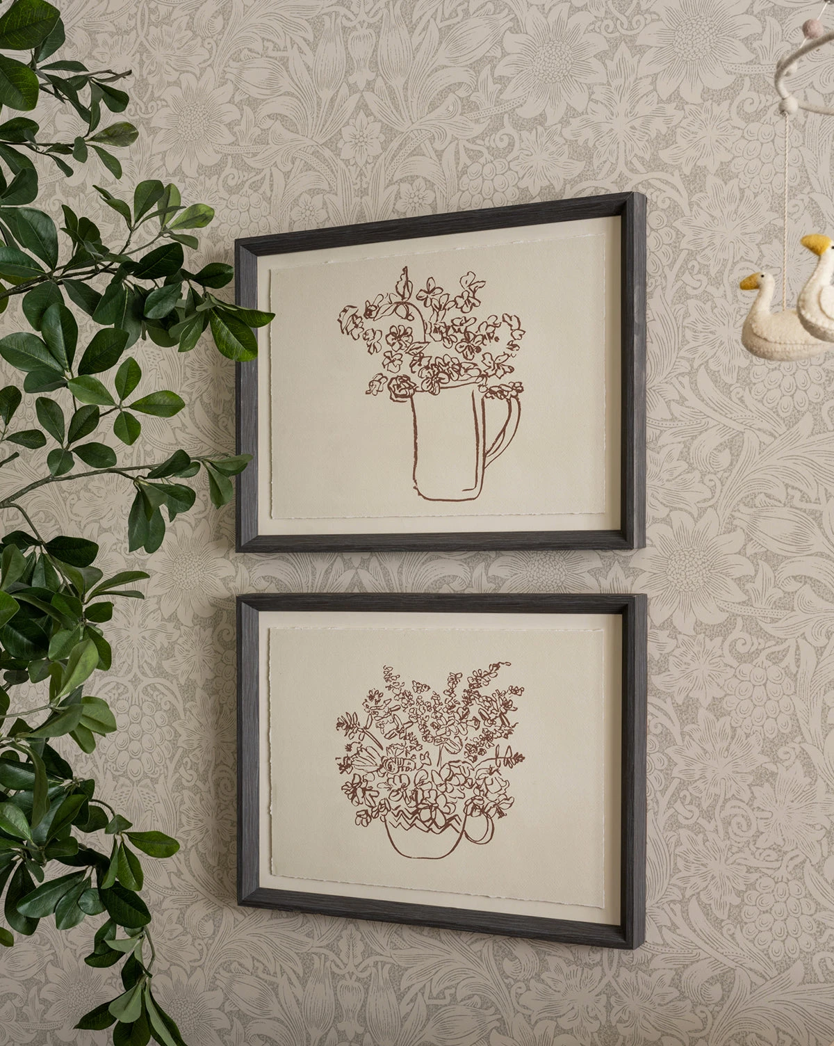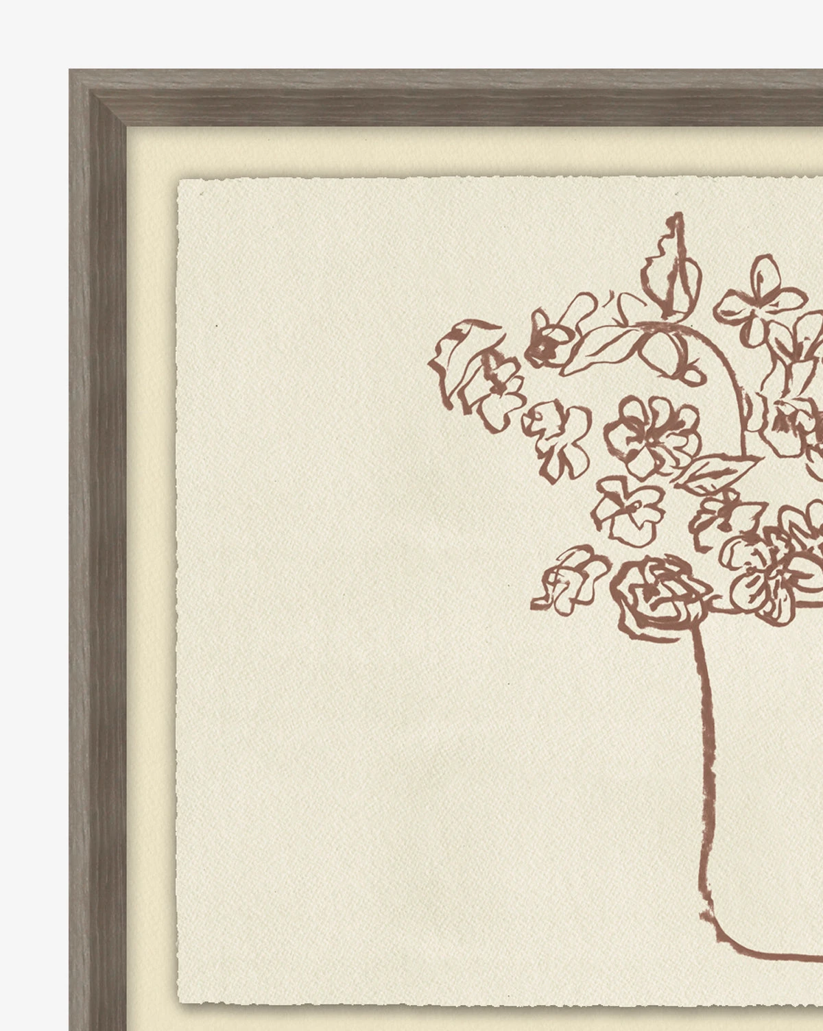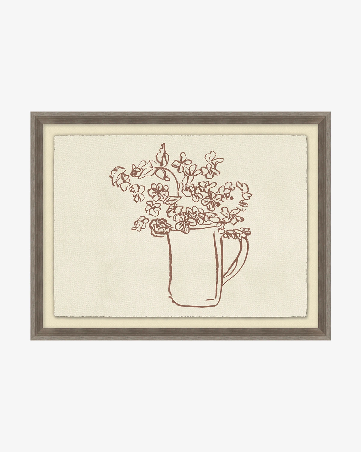 With simple brushstrokes and a unique composition, Pitcher of Flowers has a whimsical and inviting feel. The botanical still life depicts a pitcher full of small flowers bringing a playful and illustrated detail to your decor within its charcoal wood grain frame.
