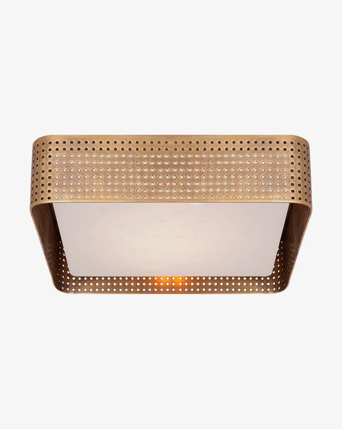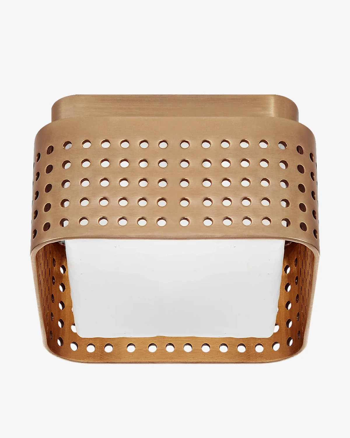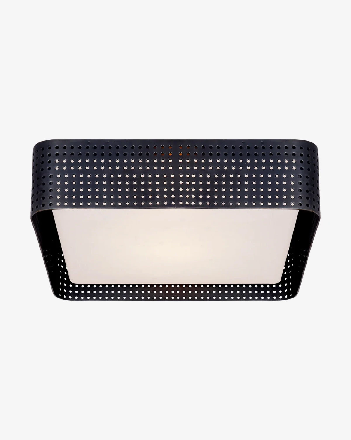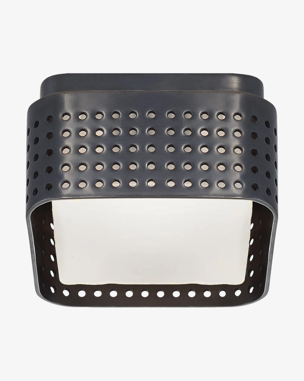 The Precision Flush Mount is an innovative take on classic ceiling lighting. Its clouded glass shade is thoughtfully contrasted with a uniformly perforated metal cage is that uniquely diffuses the light.