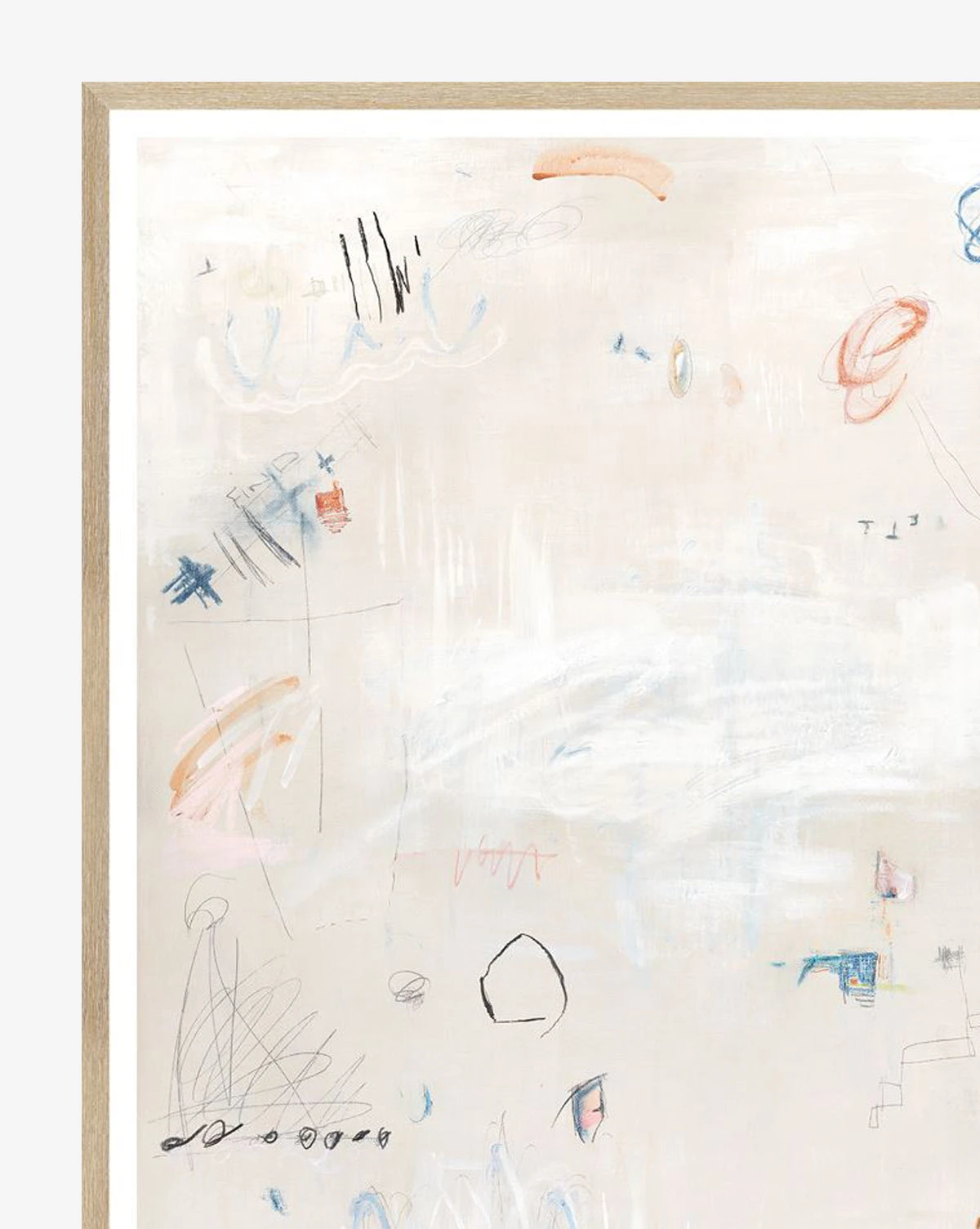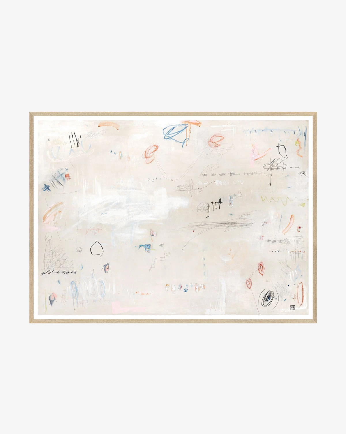 With lively, abstract scribbles scattered throughout a thoughtful composition, Primary Abstract features bright spots of color on a neutral, textured background. Its energetic feel brings liveliness to child’s bedrooms, and the piece is mounted in a natural wood frame.